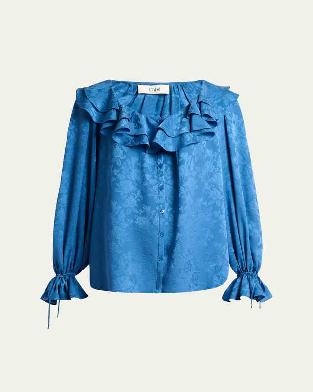 Bertha-Collar Ruffle Button-Down Silk Blouse