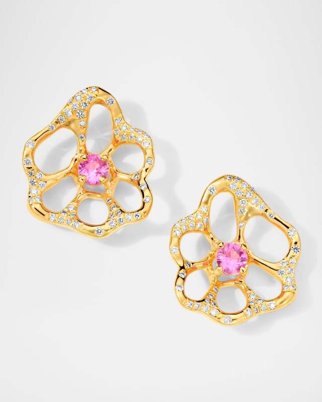 18K Gold Stardust Drizzle Flora Medium Diamond Stud Earrings with Pink Sapphires