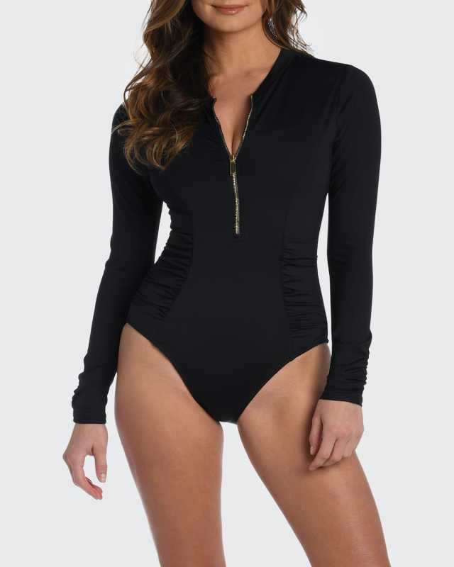 Sunbaked Jewels Shirred Rashguard One-Piece Swimsuit