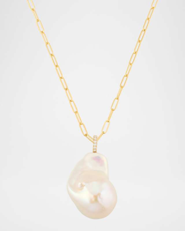 14K Yellow Gold Diamond and Baroque Pearl Link Chain Necklace, 27"L