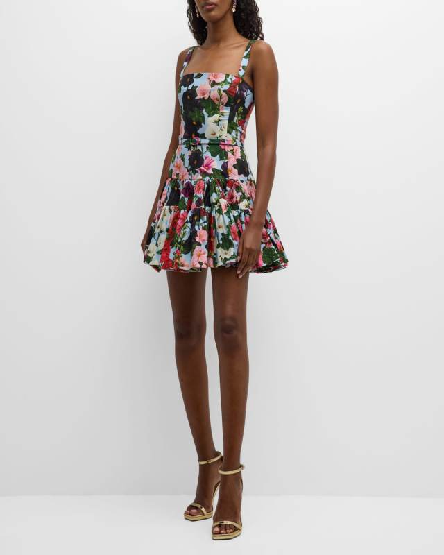 Short-Sleeve Cherry Blossom Poplin Mini Dress With Belt