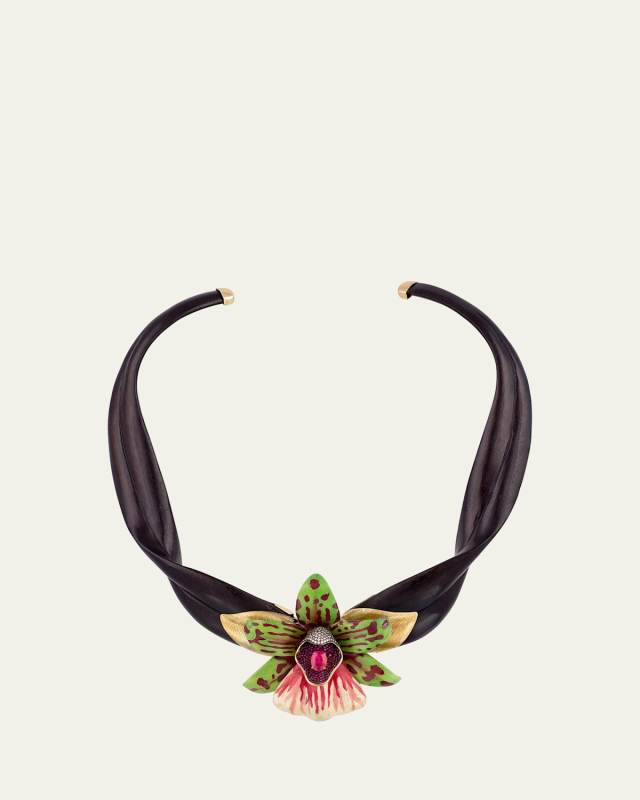 18K Yellow Gold White and Pink Marquetry Orchid Bracelet with Diamonds, Ruby and Pink Tourmaline
