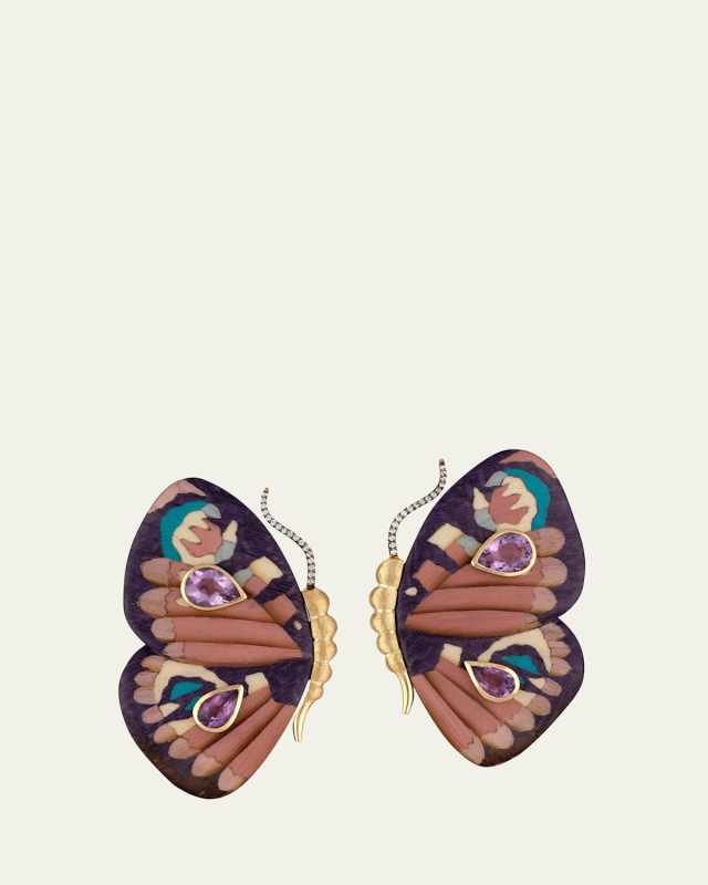 18K Yellow Gold Marquetry Butterfly Wing Earrings with Diamonds and Tourmaline