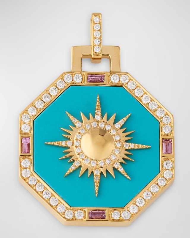 18K Yellow Gold Sapphire and Turquoise Crescent Moon Pendant