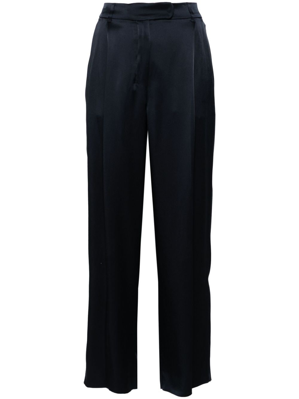 navy blue satin weave belt loops two side slash pockets front pleat detailing full-length straight leg concealed front button, hook and zip fastening