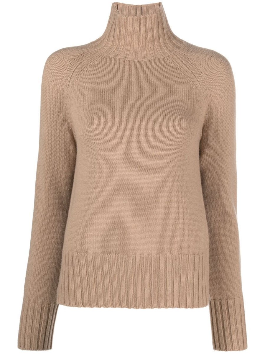 beige wool-cashmere blend fine knit ribbed trim high neck long sleeves straight hem