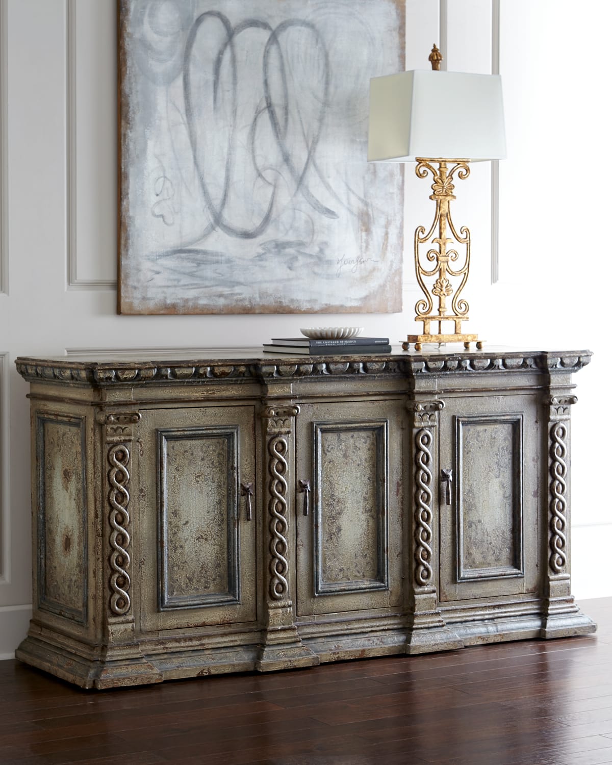 Sideboard with intricate detailing on the apron and pilasters. Made of Peruvian oak and Chilean pine. Handpainted, antiqued finish. Three doors. 81"W x 24"D x 41"T. Imported. Boxed weight, approximately 180 lbs.