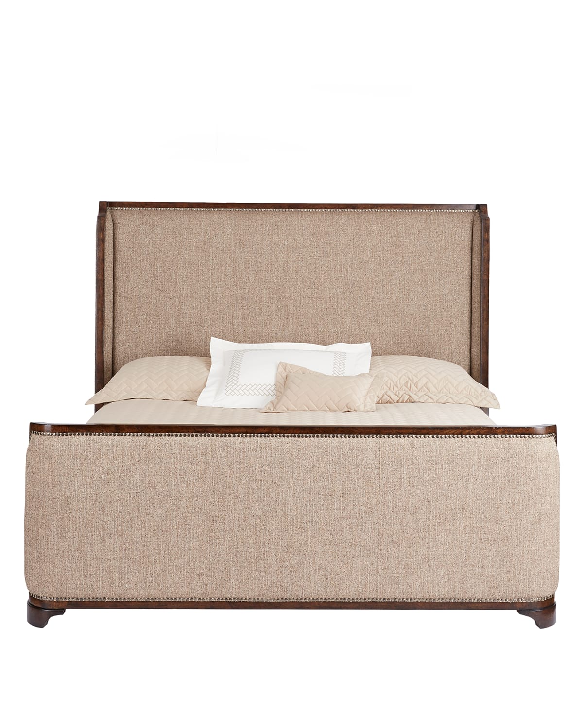 Save with discounted shipping charges when you purchase a set; set includes bed and two nightstands. Edward upholstered bed made of pine with polyester blend upholstery and zinc alloy nailhead trim. Karissa nightstand made of elm and pine solids; oak, alder wood, and walnut veneers; and wood composite with zinc alloy hardware. One drawer; two shelves. Bed, 82.25"W x 88.75"L x 66"T. Boxed weight, approximately 328 lbs. Nightstand, 38"W x 20.25"D x 32"T. Boxed weight, approximately 90 lbs. Assembly required. Imported.
