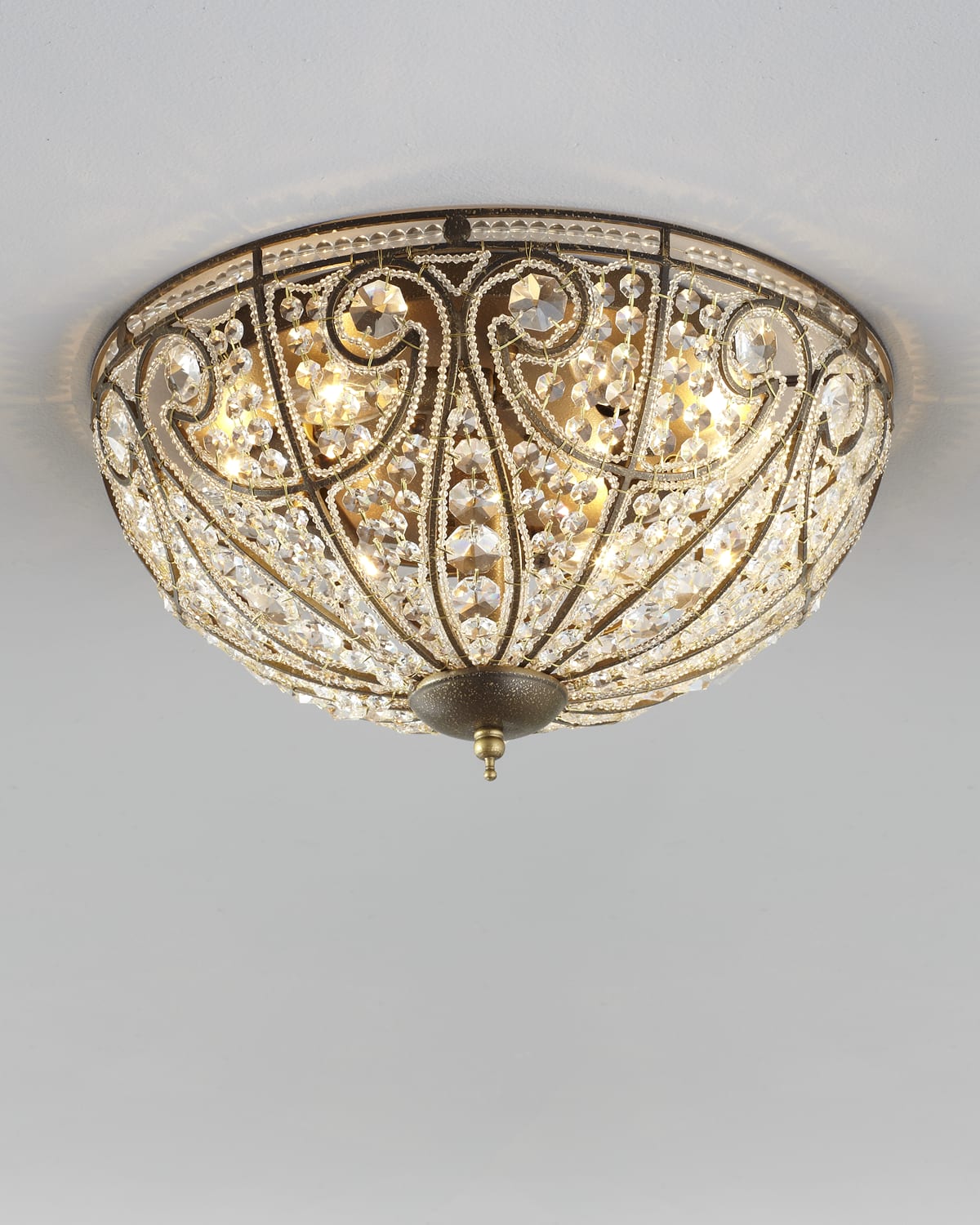 Handcrafted flushmount ceiling light. Mounts flush with the ceiling with little or no space between the fixture and the ceiling itself. Inspired by a moonlit vision of St. Paul's Cathedral. Hundreds of leadcrystal beads in a steel frame with golden finish. Uses six 60watt candelabrum bulbs. 17"Dia x 9"T. Imported.