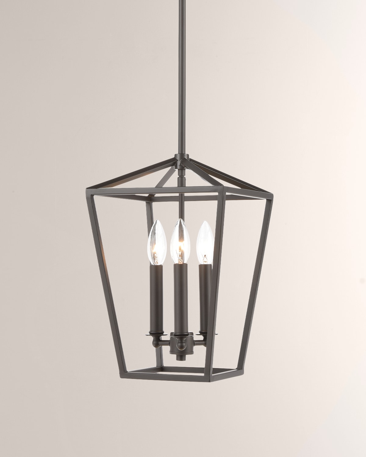 Steel open frame mini lighting pendant. Modern Farmhouse design in oil rubbed bronze. Uses three 60watt torpedo bulbs. Overall: 9"Sq. x 14"T. Cord length: 6 ft. Includes one 6" rod and three 12" rods. Can be dimmable if you buy a dimming switch. UL listed. Imported. Boxed weight, approximately 7 lbs.
