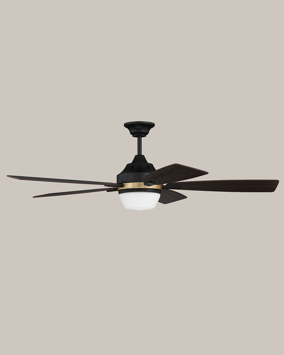 Ceiling fan with threespeed dual remote control motor Fan blades feature a reversible finish Made of steel, wood and copper Includes LED light kit Uses one 20watt bulb Comes in three pieces Hardware included Assembly required For indoor use Cord length: 6 ft. Approx. 17"T x 52"W UL listed Wipe clean Imported Weight, 19.0lbs Boxed weight, approximately 21.66lbs