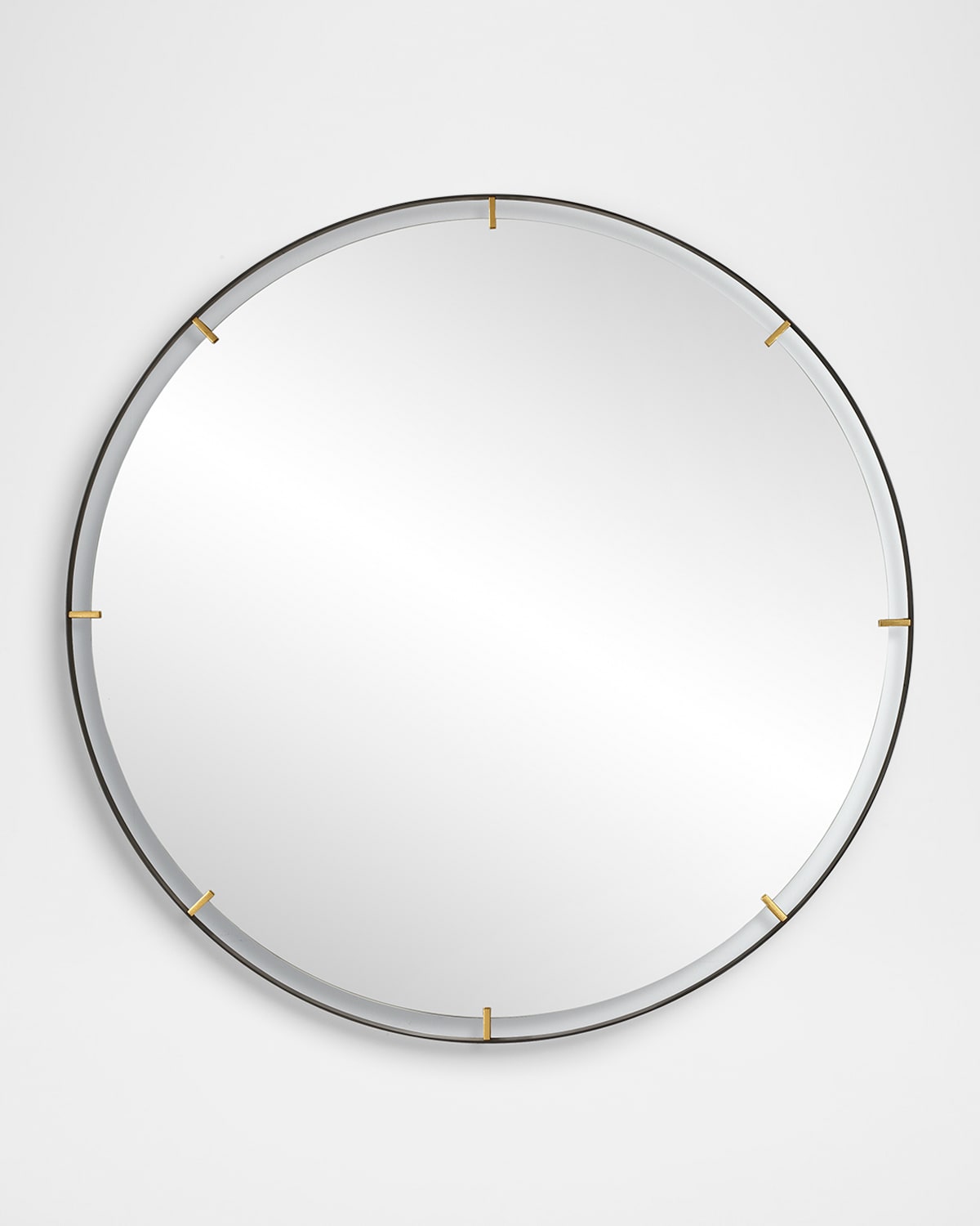 Suspended mirror features lightly antiqued gold clips Handcrafted of iron and mirrored glass with wood composite backing Overall, approx. 72"W x 2"D x 72"T Hanging hardware: French cleat Includes hanging hardware Wipe clean Weight, 150.0lbs Imported Boxed weight, approximately 166.0lbs