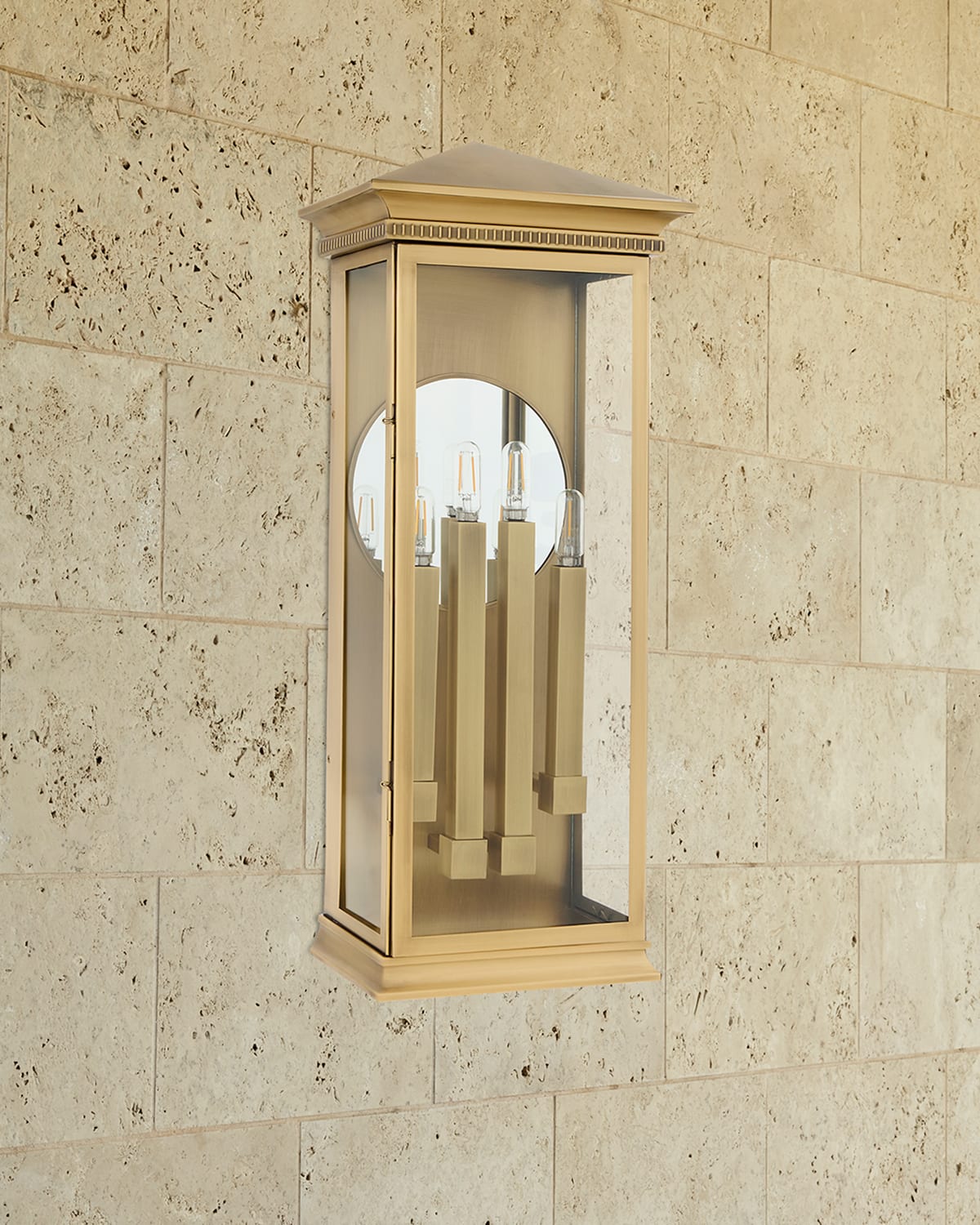 The Guilford outdoor wall mounts have a traditional lantern shape made of solid brass, giving the series an elegant and timeless appearance. Clear glass panels allow the light from candelabra sockets, which are accessible through a hingelatch door. The lanterns are topped with a peaked roof and a decorative trim, adding to its refined glamor. Illuminate outdoor spaces such as entryways, porches, or patios while adding elegance and charm with the Guildford series of wall mounts. Handcrafted of brass and glass Uses four 40watt candelabra bulbs Overall, approx. 11"L x 7.75"W x 28"T Backplate, approx. 9"W x 28"T Cord length: 10 ft. UL listed Assembly required; hardware included Professional installation recommended Imported Weight, 19.1lbs Boxed weight, approximately 24.0lbs