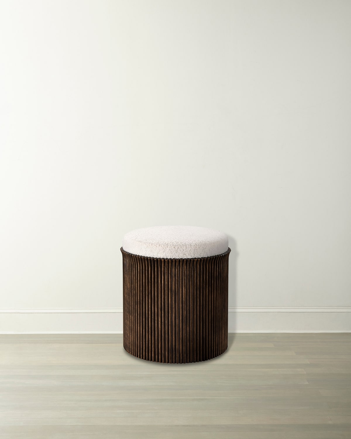The Hazel Stool has a cylindrical shape made from vertical bronze rods, creating a slightly flared, fluted texture. With a sherpaupholstered cushion, the stool is ideal for a vanity stool or accent stool. Handcrafted of engineered hardwood, polyester, and steel Overall, approx. 17.5"Dia. x 19"T Finished back Weight, 40.0 lbs Imported Boxed weight, approximately 44.0 lbs