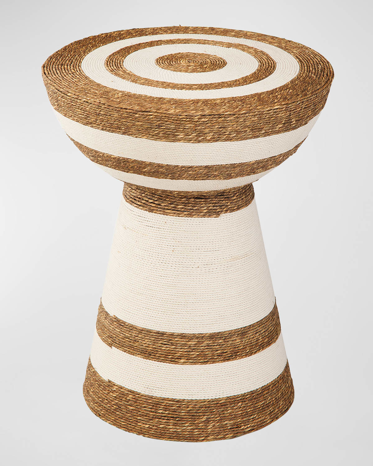 This handcrafted accent table features painted jute rope wrapped around a cast aluminum form Overall, approx. 16"Dia. x 20"T Finished back Weight, 16.0 lbs Imported Boxed weight, approximately 26.0 lbs