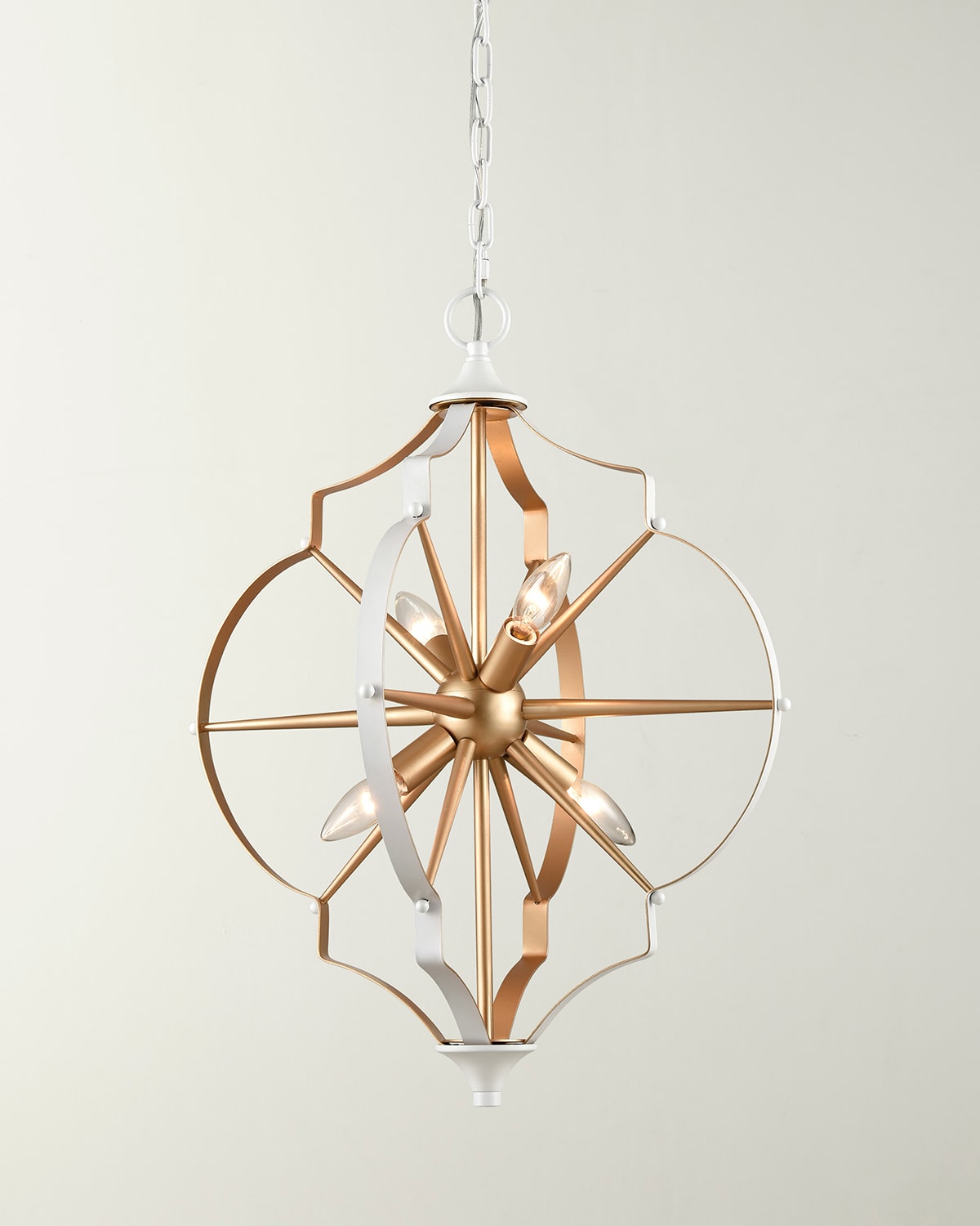 Open steel chandelier with gold finished interior accents and white outer. Overall: 18"Dia. x 23"T. Uses four 60watt torpedo bulbs (not included). UL listed. Weight: 7 lbs. Imported. Boxed weight, approximately 12.7 lbs.