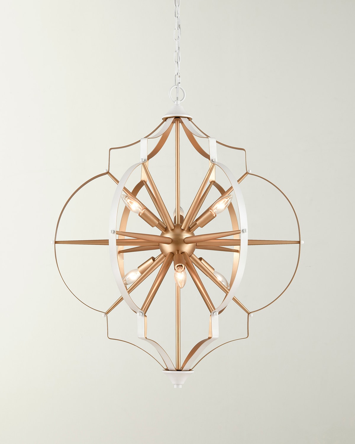 Open steel chandelier with gold finished interior accents and white outer. Overall: 26"Dia. x 31"T. Uses six 60watt torpedo bulbs (not included). UL listed. Weight: 13 lbs. Imported. Boxed weight, approximately 26 lbs.