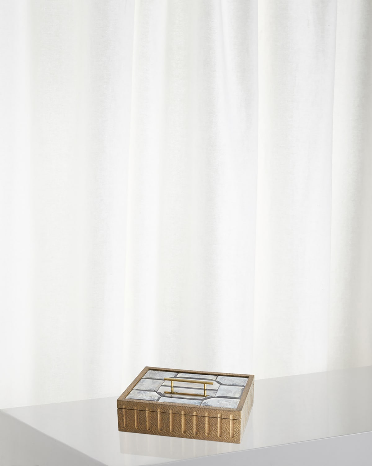 The Luxor Collection is an exquisite fusion of elegance and artistry. The Luxor Box is crafted with mitered corners and handapplied, delicately embossed brass cladding, resulting in a seamless and luxurious finish. Handembossed finishing nails add a touch of refinement, while the handcut antiqued mirrored glass panels generate captivating light play. Inside, the boxes are painted black for a striking contrast and a touch of drama. Whether used to store treasured keepsakes or as a decorative accent, these boxes are sure to make a statement in any space. Handcrafted of MDF, mirror, and brass Approx. 14.25"L x 11.3"W x 5.5"T Item weight, 9.5 lbs Wipe clean Imported Boxed weight, approximately 11.5 lbs