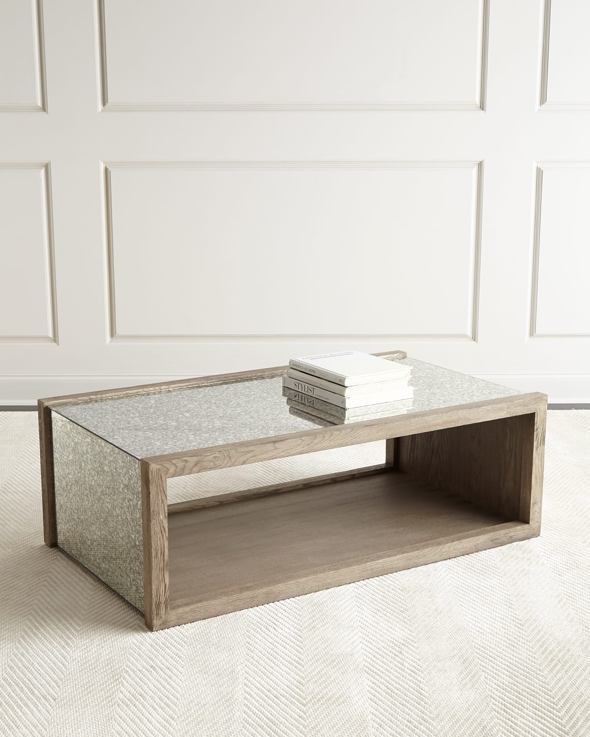 Handcrafted coffee table. Oak and antiqued mirror glass. 53"W x 30"D x 18"T. Imported. Boxed weight, approximately 109 lbs. Please note that this item may require additional shipping charges.