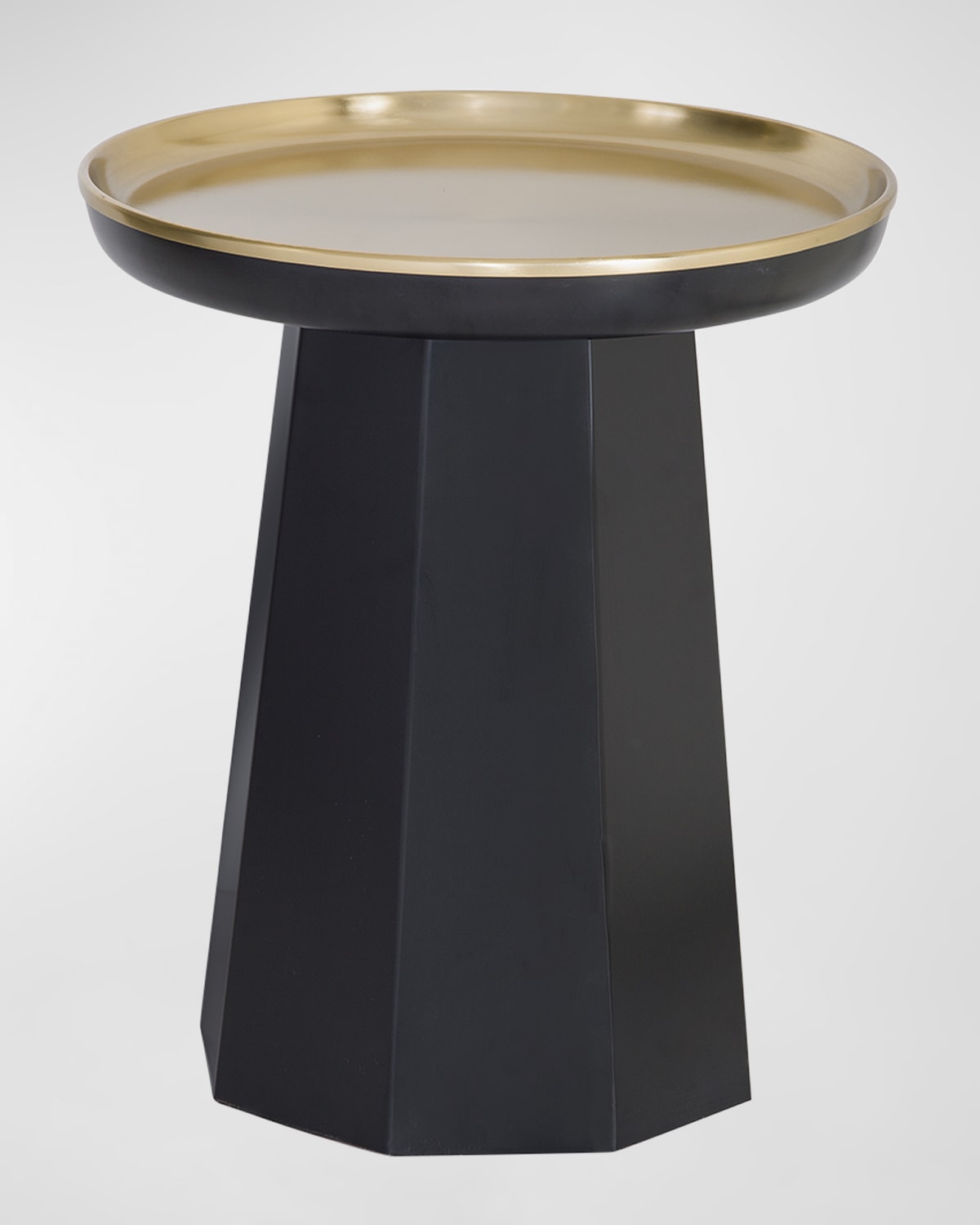 This accent table features a modern design with a hexagonal tapered base and traystyle top. Handcrafted of iron and brass Overall, approx. 17"Dia. x 19"T Finished back Weight, 18.0 lbs Imported Boxed weight, approximately 23.0 lbs