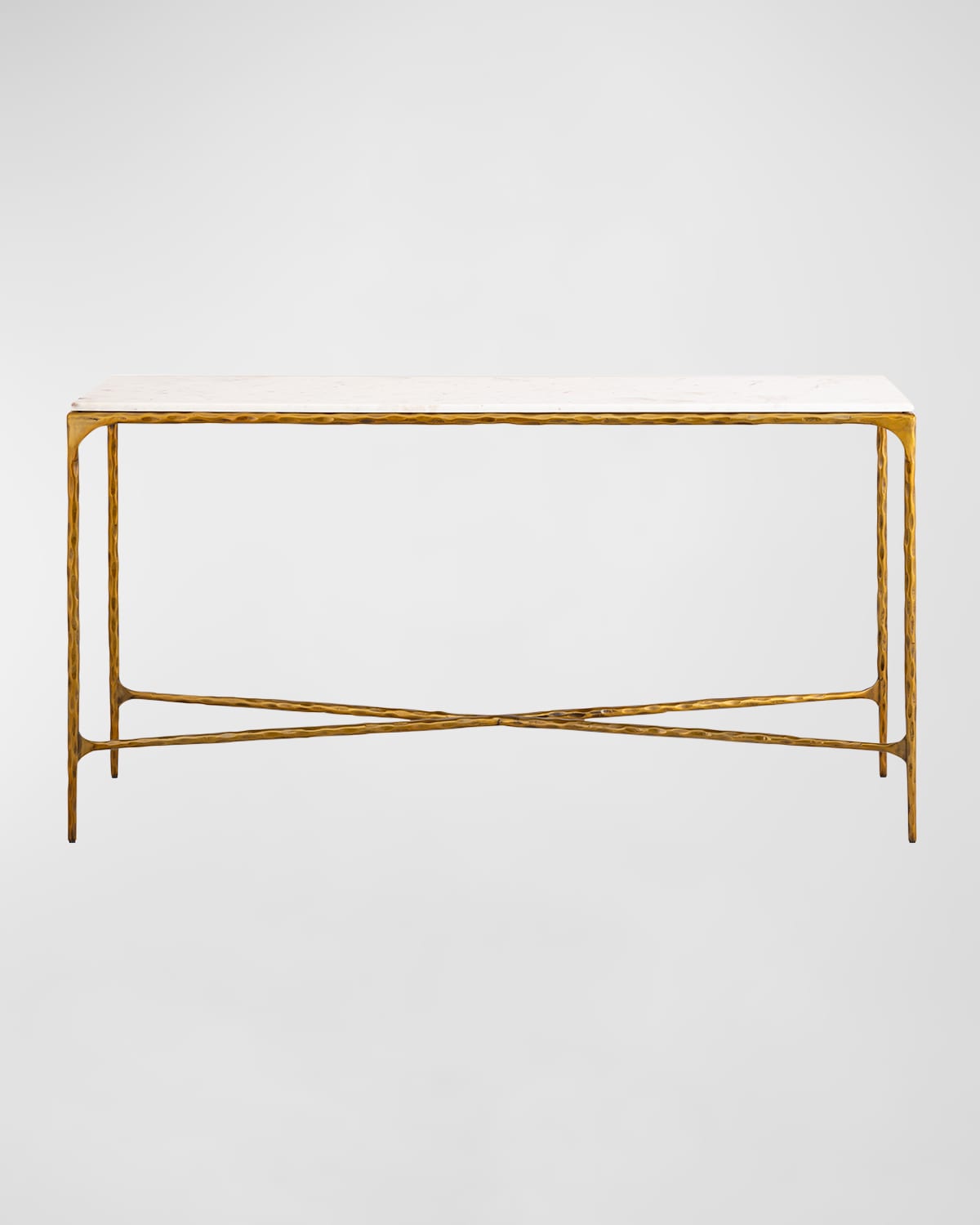 Forged Console Table made from slender bars of forged iron. The narrow rectangular table has crisscrossing support beams and a white marble top. This table is simple, stylish, and highly versatile. Handcrafted of iron and marble Finished back Overall, approx. 60"W x 16"D x 32"T Weight, 125.0lbs Imported Boxed weight, approximately 160.0lbs