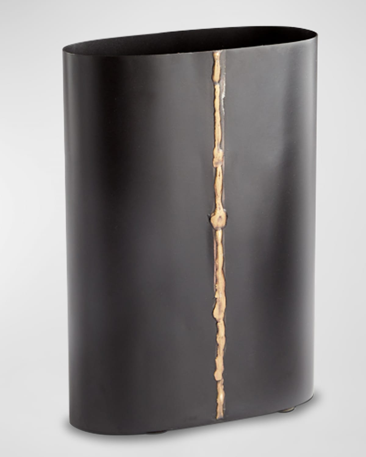 The smooth, oval "Begonia" vase comes in a satin black finish with a vertical brass detail down the front that adds a touch of intrigue. Handcrafted of iron Approx. 7"L x 3"W x 10"T Sold individually Item Weight (Lbs.): 2.0 For indoor use Wipe clean Imported