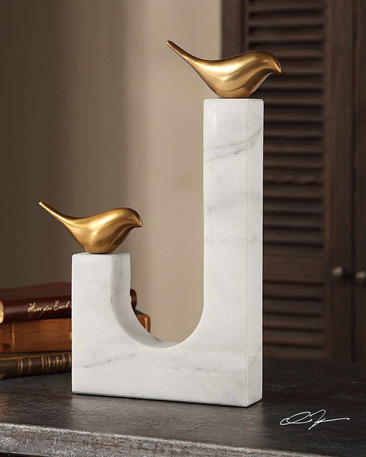 Two cast brass, stylized songbirds counterpoised on a white marble sling base. Approx. 10.8"W x 1.8"D x 13.3"T. Imported. Boxed weight, approximately 9 lbs.