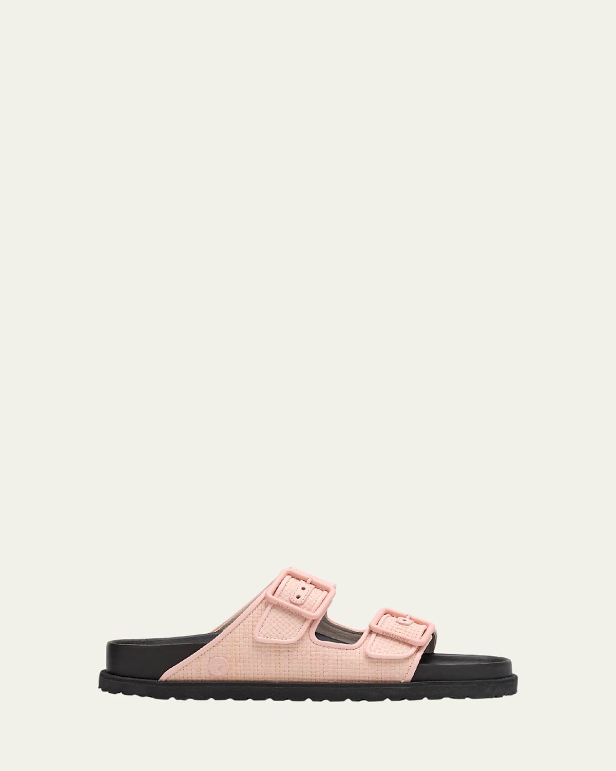 BIRKENSTOCK "Milano" woven raffia comfort sandals with leather piping. 0.4" flat heel. Open toe. Dual buckle strap vamp. Slide style. Molded footbed. Lightweight, flexible EVA outsole. Made in Italy.