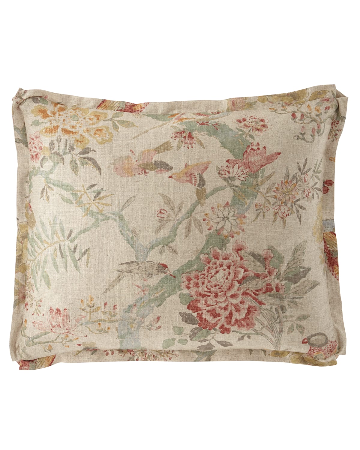 Bird and floralprint sham with self flat flange. Linen/cotton. Dry clean. 20" x 26". Made in the USA of imported materials.