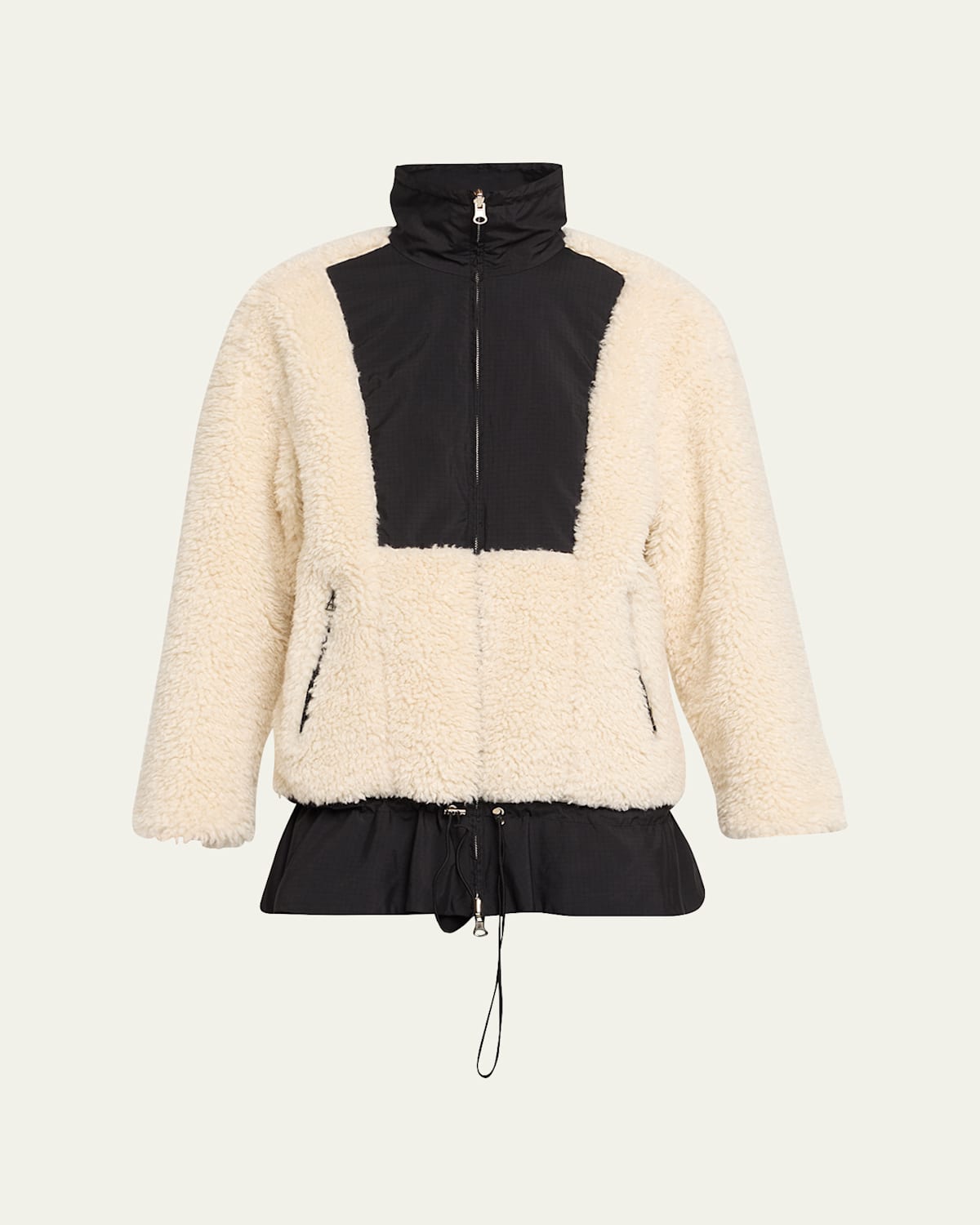 Crafted from plush sherpa and ripstop, this 3.1 Phillip Lim utility jacket features a contrast recycled nylon panel and cozy fleece for a soft take on sporty, transitional layering. Stand collar Long sleeves Dropped shoulders Two side zip pockets Ruffled drawstring hem Voluminous silhouette Zip front closure Polyester Dry clean Imported