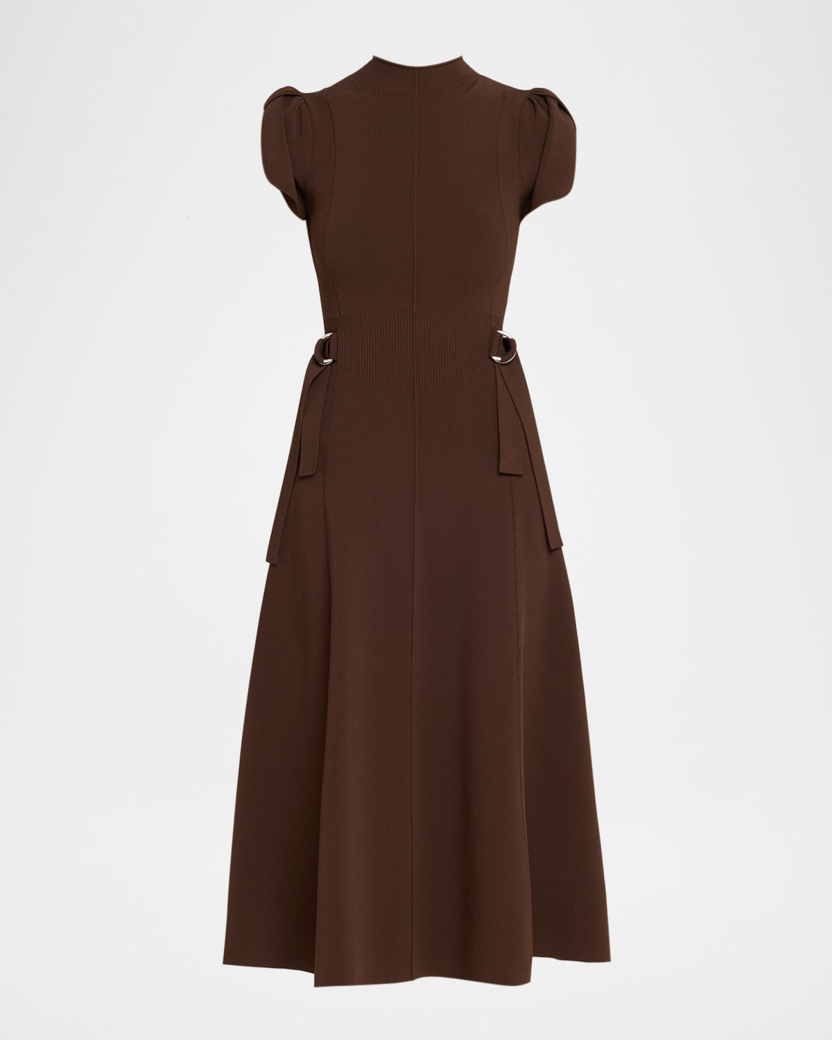 Crafted in compact ribknit, this 3.1 Phillip Lim midi dress boasts tulip sleeves and adjustable Dring sides for a personalized fit. Mock neckline Short sleeves Aline silhouette Hem falls below the knee Slipover style Viscose/polyester Dry clean Imported