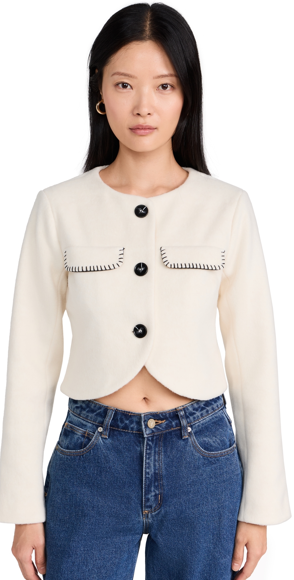 Fabric: Heavyweight, non-stretch felt. Faux flap breast pockets with blanket stitch trim. Crew neck. Long sleeves. Button placket. Shell: 77% polyester/9% wool/7% polyamide/7% viscose. Lining: 100% polyester. Wash cold. Imported, China. Measurements: Measurements from size XS Length: 17.25in / 44.0cm, from shoulder