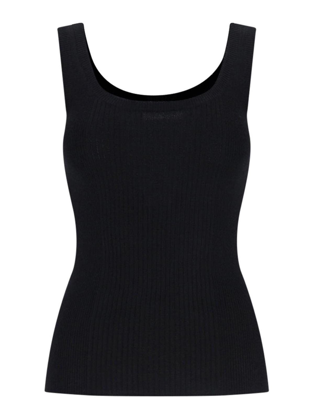 Débardeur en chemise 6397, en laine et cachemire noir, traitement côtier, encolure ronde, fines bretelles, ourlet droit.