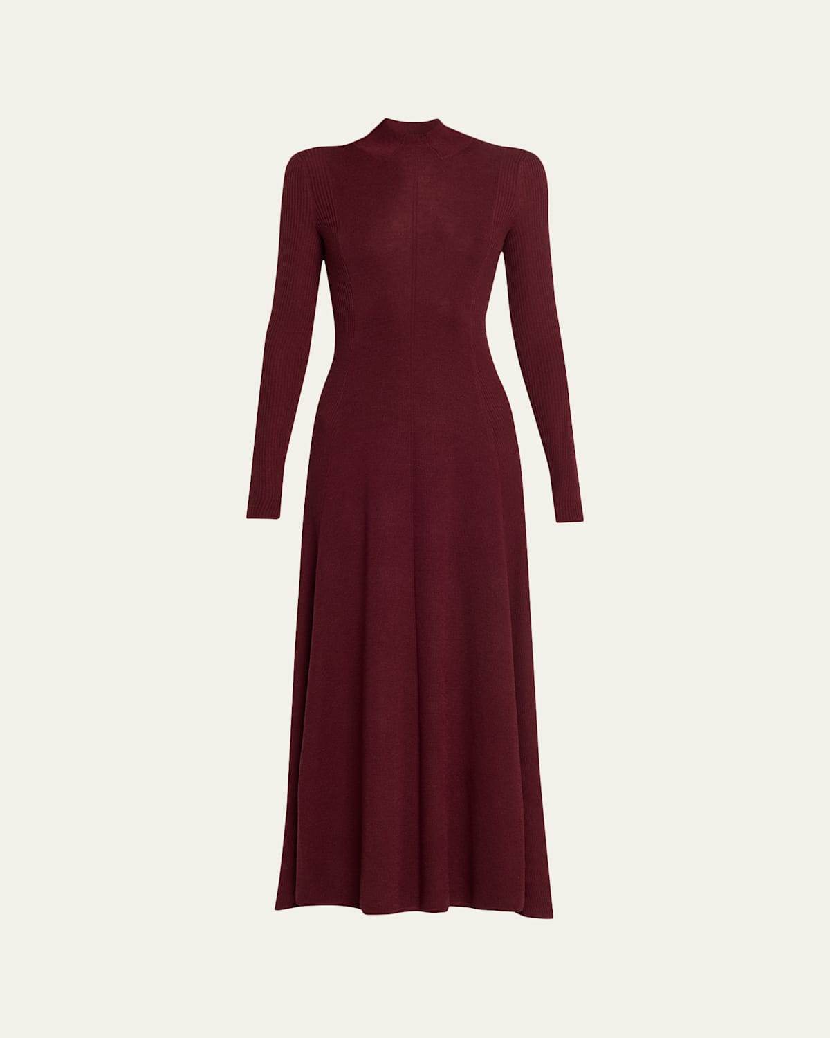 MARIA MCMANUS elegant knit dress shaped with godets for voluminous flair Mock neckline Long sleeves Tea length Fit amp; flare silhouette Slipover style Merino wool Unlined Hand wash or dry clean Imported