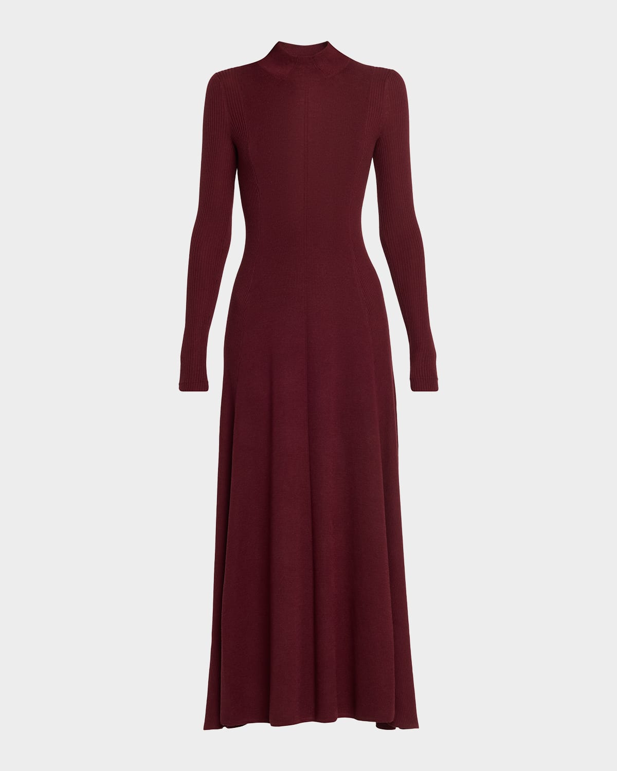 MARIA MCMANUS elegant knit dress shaped with godets for voluminous flair Mock neckline Long sleeves Tea length Fit amp; flare silhouette Slipover style Merino wool Unlined Hand wash or dry clean Imported
