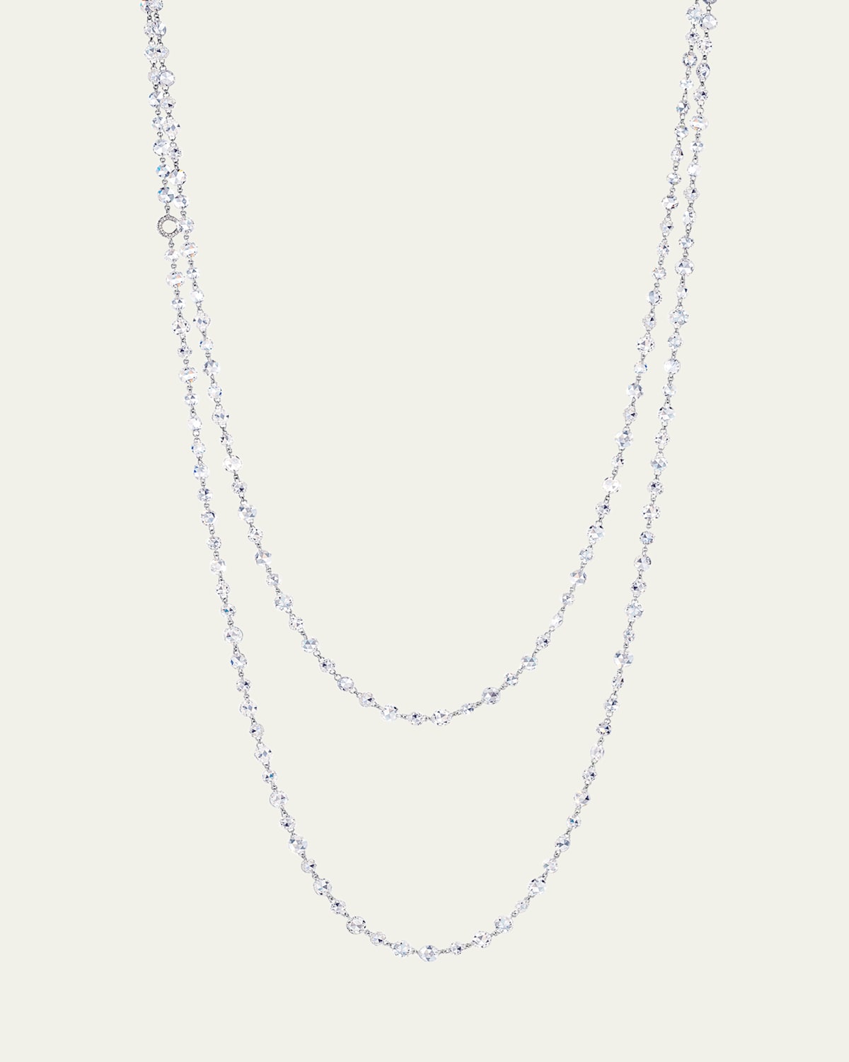 64 Facets ethereal diamond chain necklace is a timeless piece with the ability to compliment anything you wear. Our master craftsmen handcut and drill tiny holes into each round rosecut diamond and pass delicate platinum links through the holes to join each diamond. 18karat white gold Necklace length: approx. 48 inches Adjustable length Lobster clasp Total diamond carat weight: 27.49 Imported