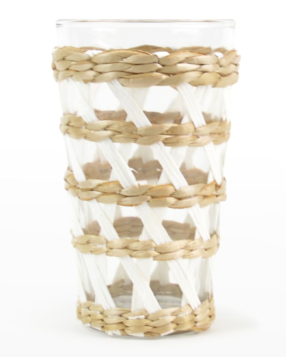 Tumbler glasses are made of glass with a rattan sleeve around exterior Approx. 3.5"Dia. x 6"T Tapers to 2"Dia. at bottom Item Weight (Lbs.): 0.3 Hand wash Set of four Imported