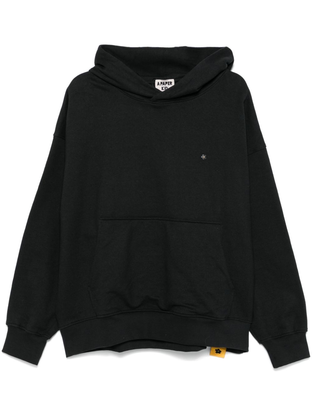 black cotton jersey texture pullover design slouchy hood drop shoulder long sleeves ribbed cuffs and hem appliqué logo at the chest front pouch pocket French terry lining straight hem When buying this unisex item, keep in mind that it is graded in standard men's sizing.