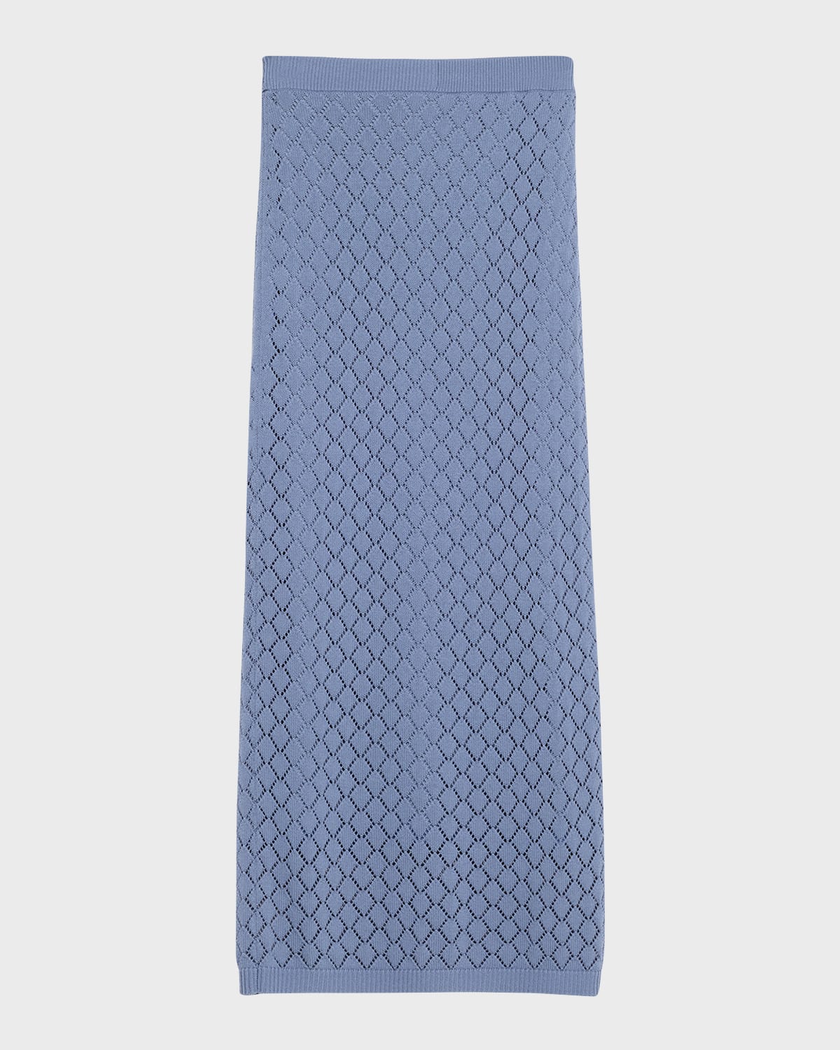 A.L.C. "Addison" midi skirt crafted from a soft cottonsilk pointelle fabric Midrise; sits high on the hip Elastic waistband Skirt falls straight from hip to hem Hem falls below the knee Pullon style Cotton/silk Dry clean Imported