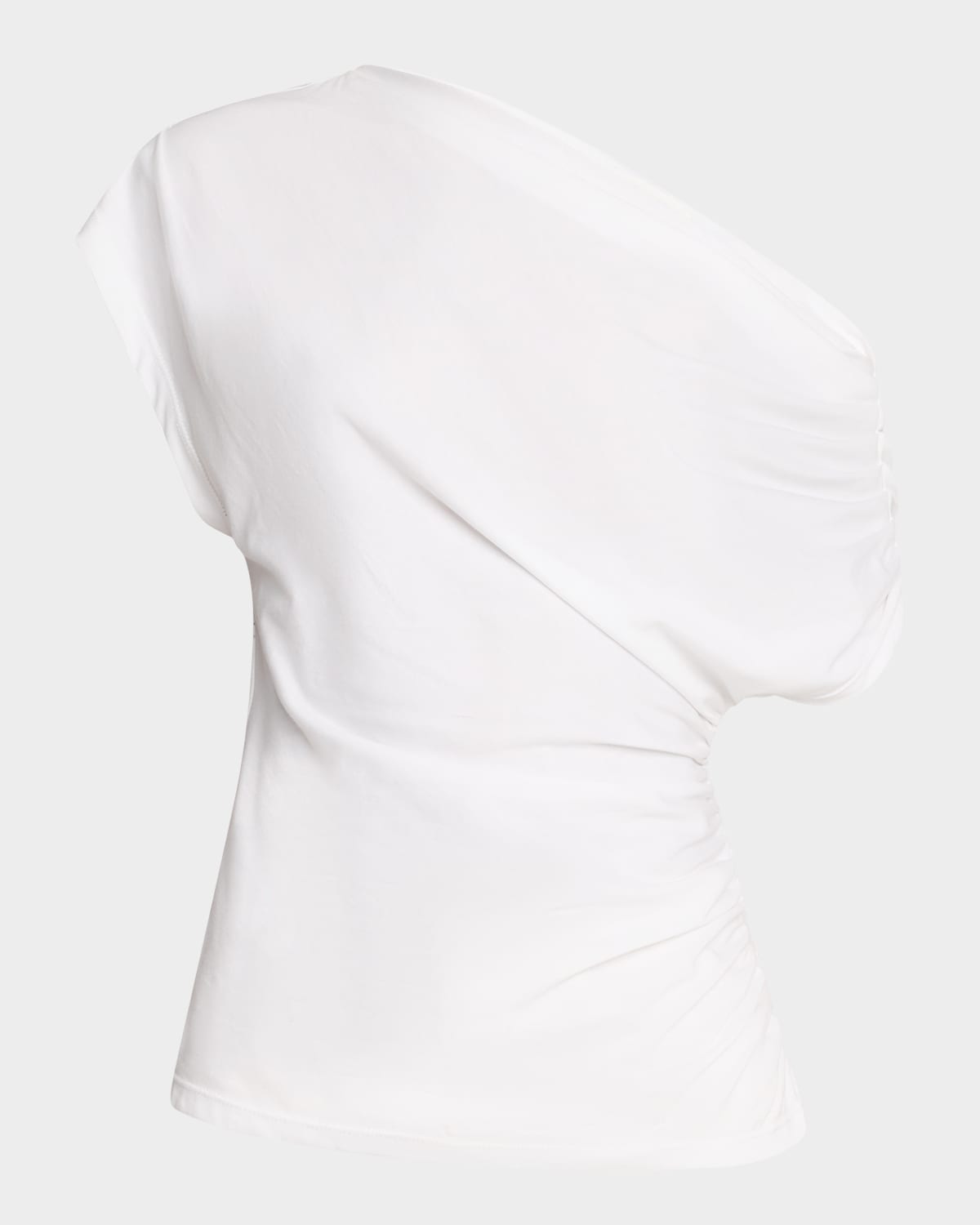 A.L.C. "Alice" draped tee with ruching Oneshoulder neckline Sleeveless Slim fit Hem sits at the hip Pullover style Cotton Dry clean or machine wash cold Made in USA from imported materials