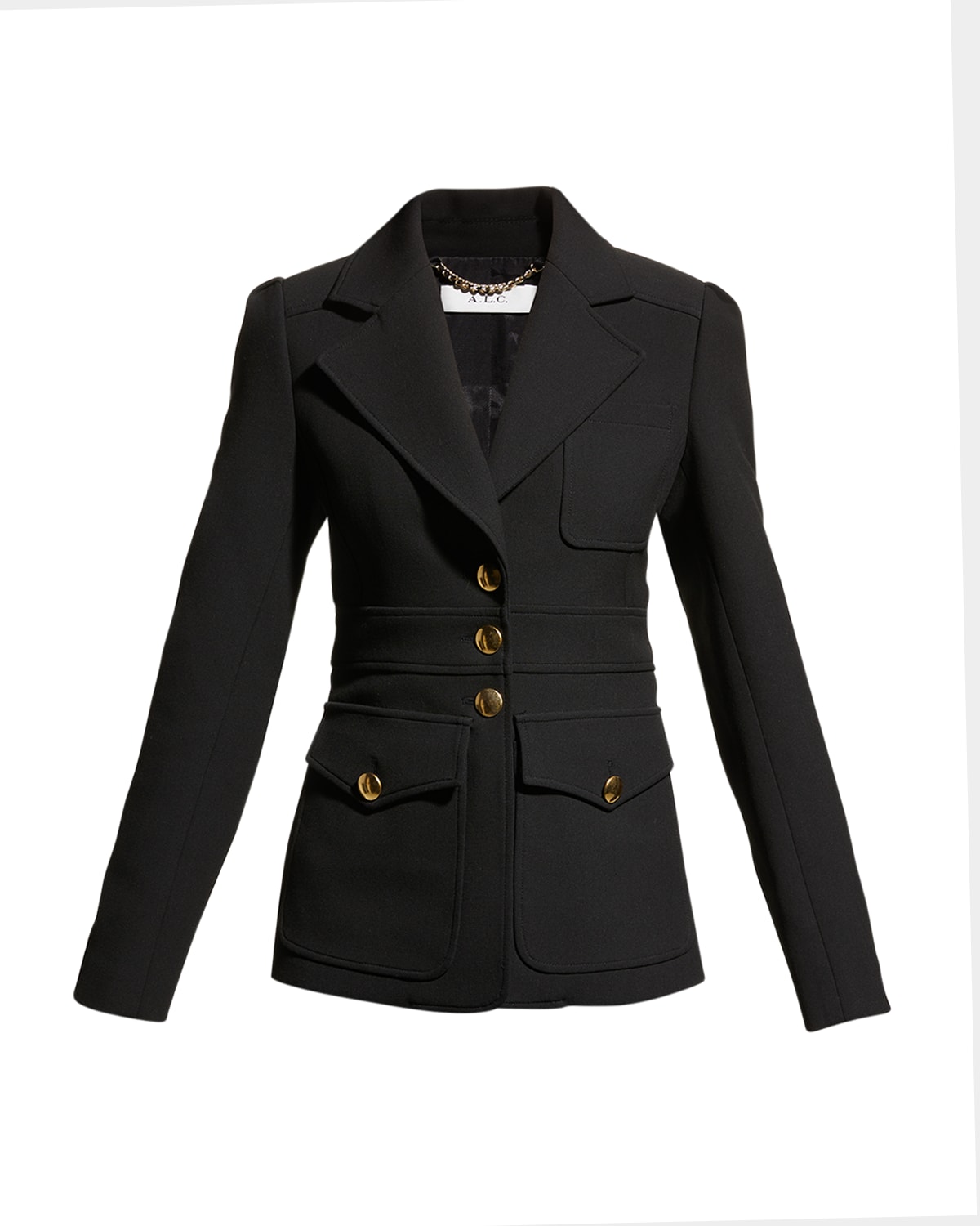A.L.C. "Amelia" militaryinspired jacket refined by golden shank buttons Approx. 26.3"L from shoulder to hem Notched lapels; button front Long sleeves Tailored fit Chest patch and button flap pockets Hip length Polyester/viscose/cotton Lining: Cotton/polyester Dry clean Imported