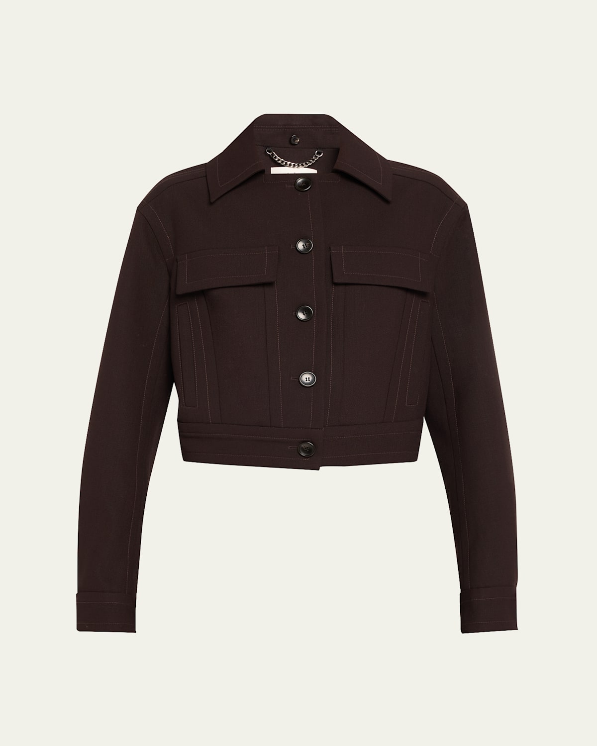 A.L.C. "Blake" woolblend jacket with tonal stitching Point collar Long sleeves with button cuffs Dual chest pockets Side slip pockets Tailored fit Cropped length Buttonfront Wool/viscose/polyester Lining: Cotton/polyester Dry clean Imported