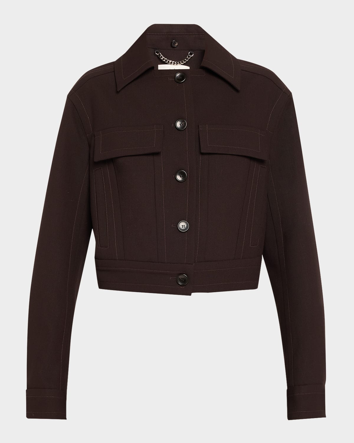A.L.C. "Blake" woolblend jacket with tonal stitching Point collar Long sleeves with button cuffs Dual chest pockets Side slip pockets Tailored fit Cropped length Buttonfront Wool/viscose/polyester Lining: Cotton/polyester Dry clean Imported