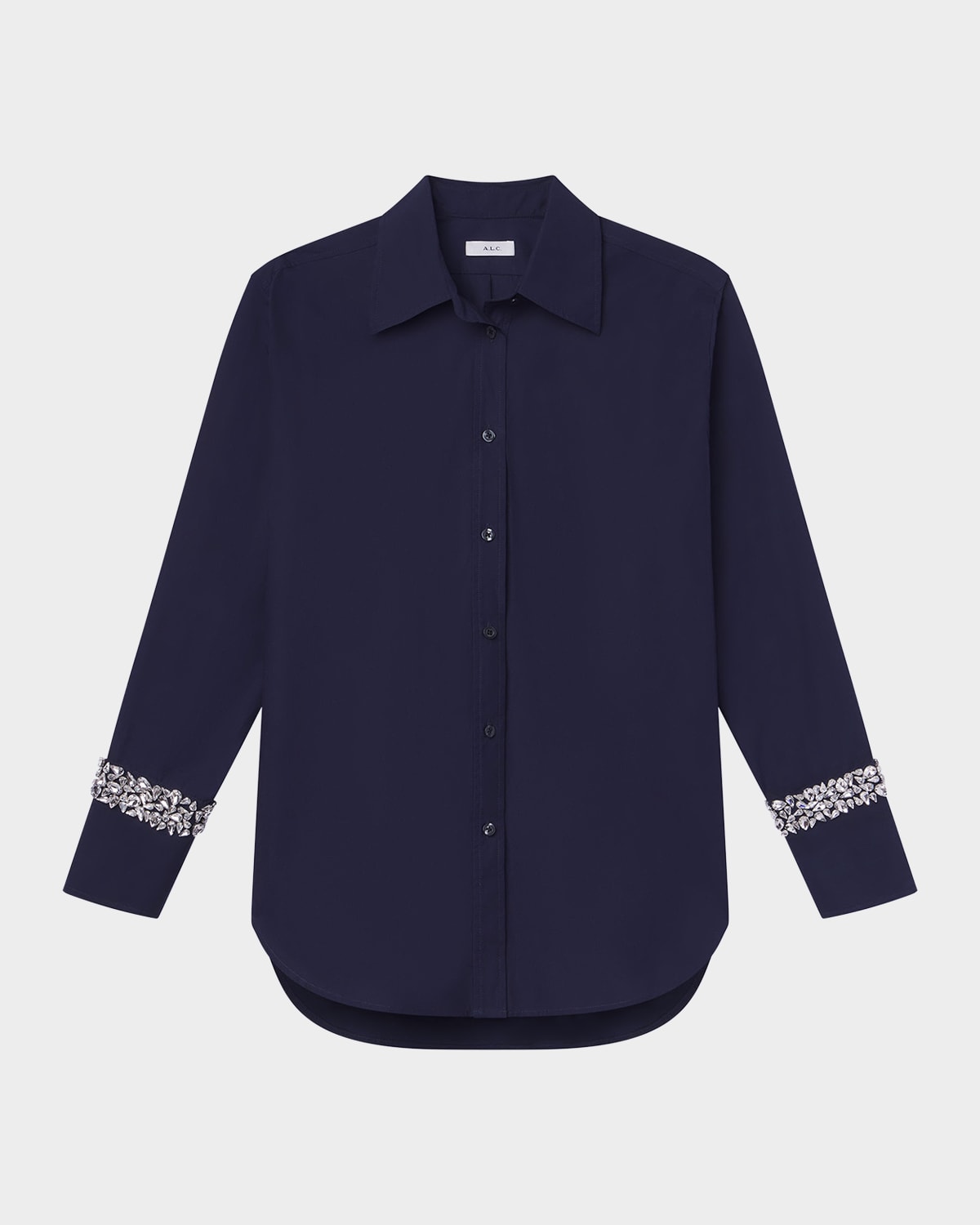 A.L.C. "Calvin" classic cotton top featuring crystal embellishment at the sleeves Point collar Long sleeves with button cuffs Relaxed fit Rounded hem Buttonfront Cotton Dry clean Imported