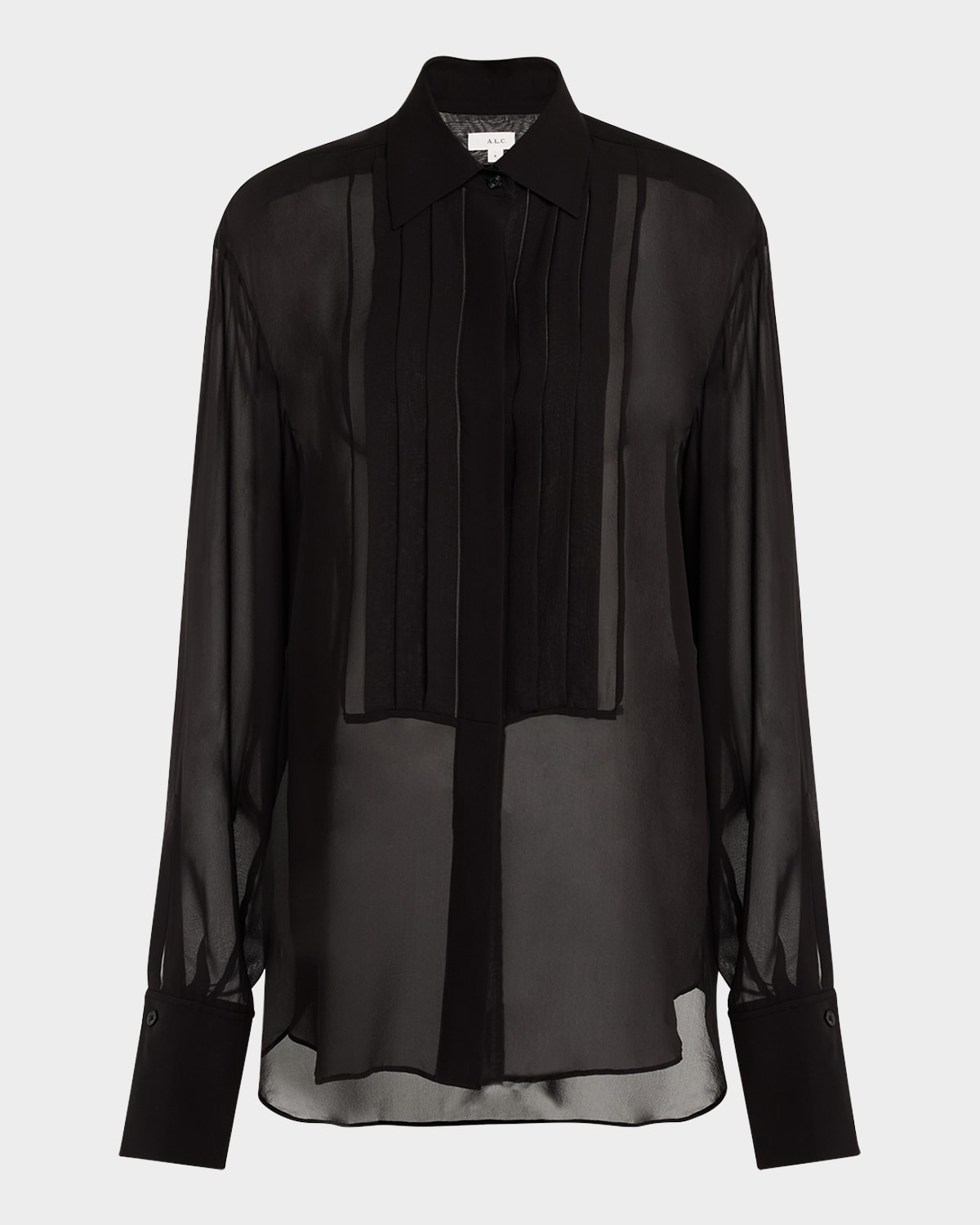 A.L.C. "Camden" sheer silk top featuring a pleated bib Point collar Dropped shoulders Long sleeves with button cuffs Relaxed fit Hem falls to the hip Buttonfront Silk Dry clean Imported