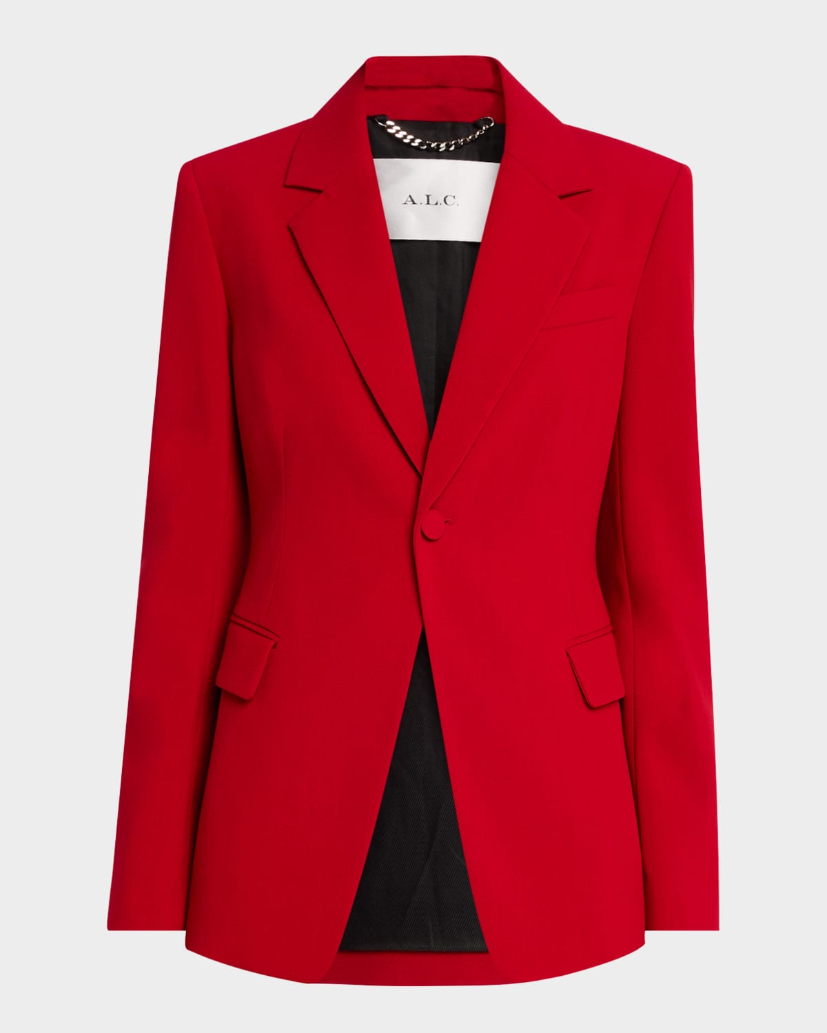 A.L.C. "Elza" solid woolblend jacket Notch lapels Singlebreasted front Long sleeves with button cuffs Chest welt pocket Hip flap pockets Tailored fit Cutaway hem Buttonfront Wool/viscose/polyester Lining: Cotton/polyester Dry clean Imported