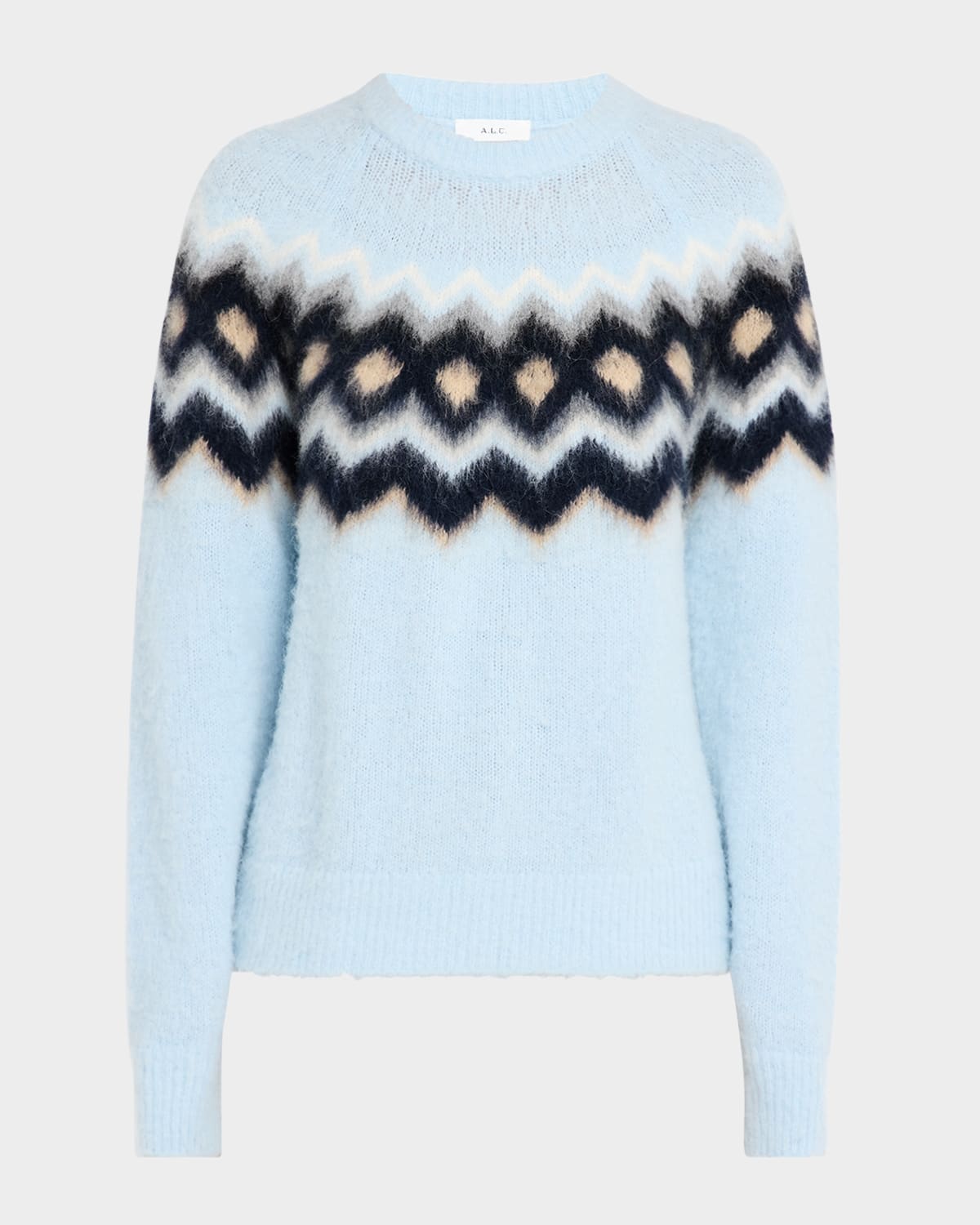 A.L.C. "Ezra" fuzzy alpacablend sweater featuring a fairisle motif Crew neckline Long raglan sleeves Relaxed fit Hem falls to the hip Pullover style Wool/merino wool/nylon/polyamide Imported
