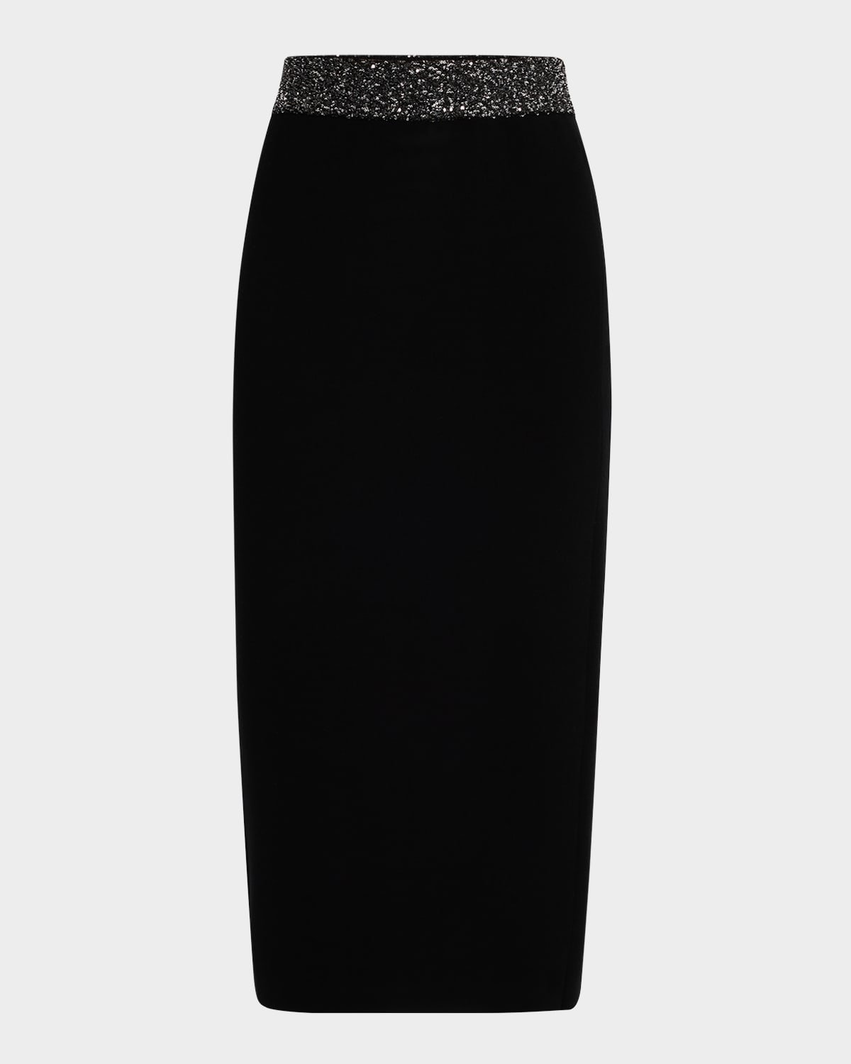 A.L.C. "Jane" knit midi skirt featuring an embellished waistband High rise Elastic waistband Bodycon fit Hem falls below the knee Pullon style Viscose/polyester Dry clean Imported