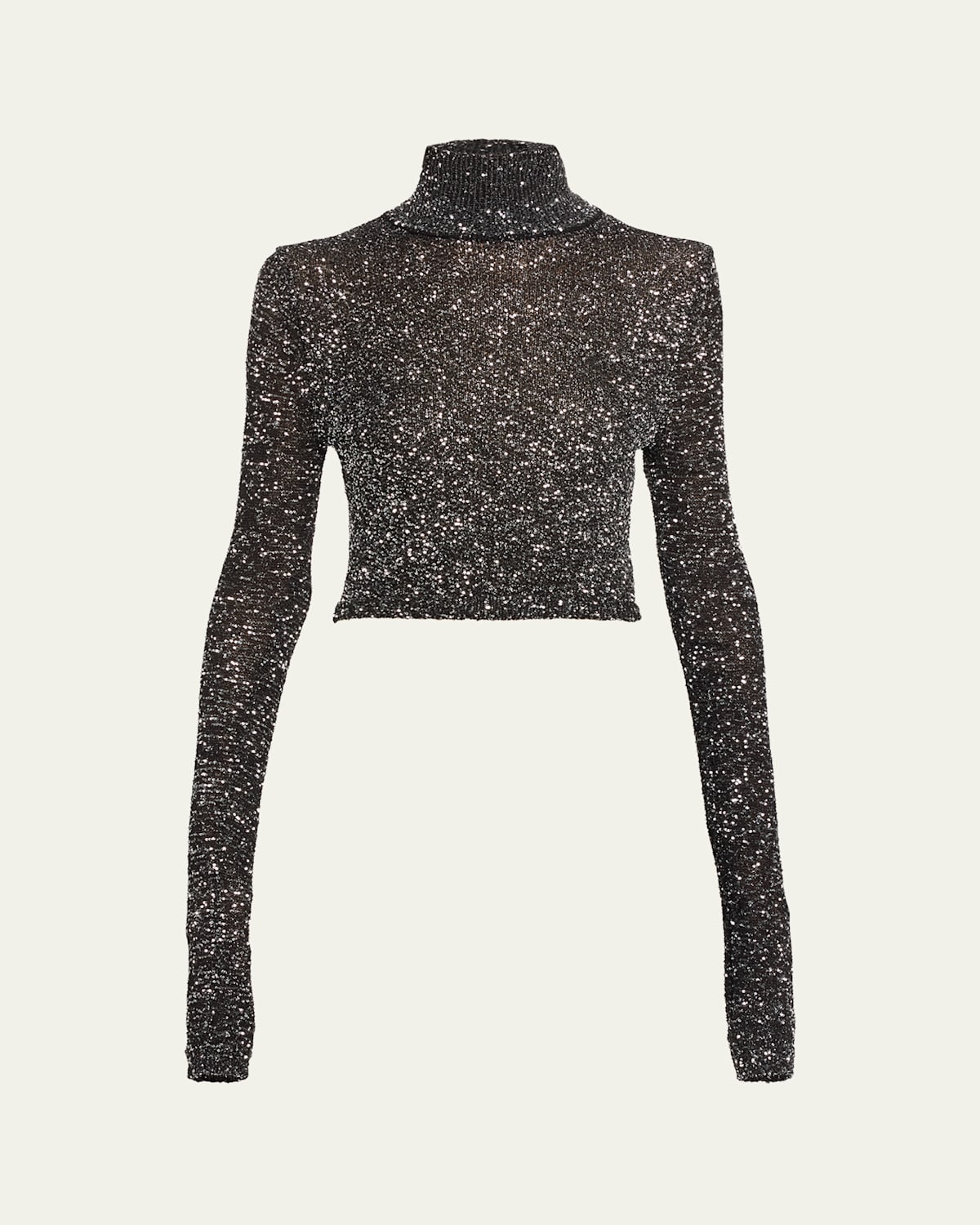 A.L.C. "Kendall" sparkly knit sweater Turtleneck Long sleeves Cropped fit Hem sits at the hip Pullover style Polyester Imported
