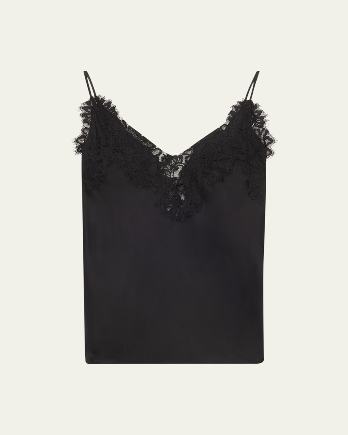A.L.C. "Lennon" satin cami top featuring tonal lacetrim V neckline Adjustable spaghetti straps Slim fit Hem falls to the hip Pullover style Viscose/nylon/polyamide Dry clean Imported